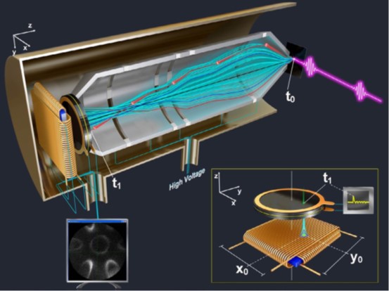 当脉沖激光到达样品表面时,其中的一小部分光子会被样品反射到MCP上,MCP会探测到光子并记录光子到达的时刻t0。样品与电子探测器之间的距离约1米,在这段时间内光子飞行的时间可以忽略不计,因此t0可以作为脉冲激光到达样品的时间,也就是光电子飞行的起始时间。每个光电子在电子透镜组中沿着特定的轨道到达MCP的时刻用t1来表示, t1- t0便可以得出光电子从样品表面到MCP的飞行时间t。 DLD由两组相互垂直的铜导线构成,当经过MCP放大后的电子团到达DLD时,便会在对应位置的两根导线上激发出局域电流,局域电流会分成两部分向导线的两端移动,并被记录到达导线端点的时刻,分别为tx1, tx2, ty1, ty2,通过这四个时刻便可以得出电子团到达DLD的位置,即光电子到达电子探测器的位置x和y。对于数据的存储,实际上是使用平面极坐标系,利用r=√(x^2+y^2 )=以及cos∅=x/r, sin∅=y/r将(x,y)转换成(r, ∅ ),再通过相应的转换关系便可以得到光电子的能量和动量信息。